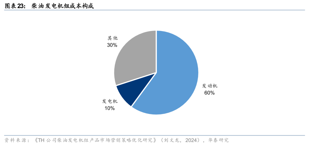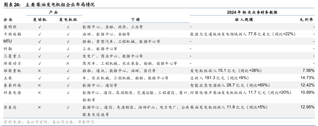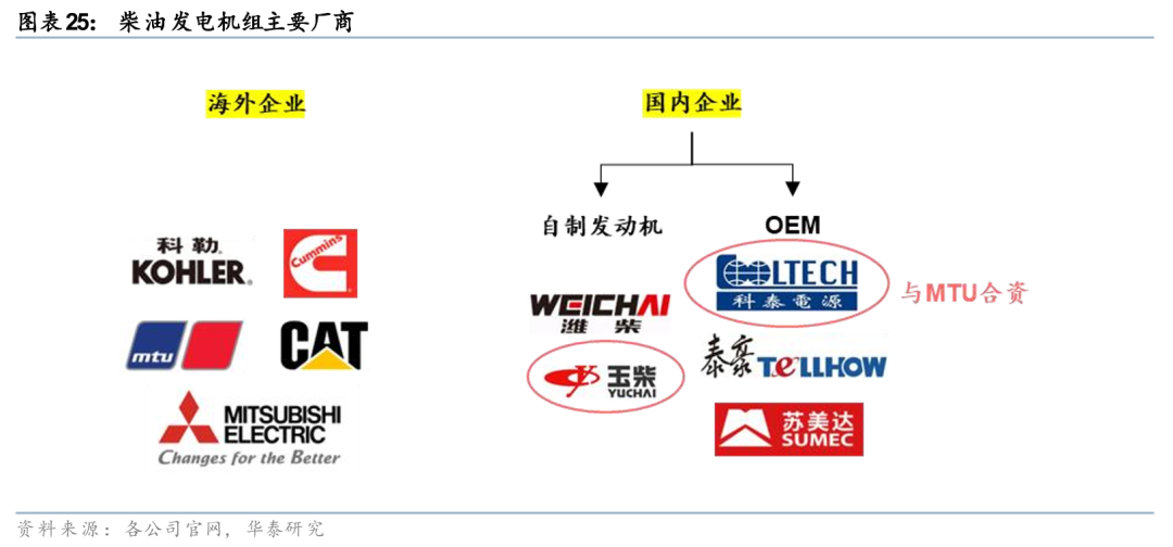 关注1:核心零部件发动机市场以海外企业为主导,国内企业有望加速替代。发动机为柴油发电机组的主要部件之一,成本占比约60%。海外柴油发电机组企业以自制发动机为主,而国内企业多采购海外发动机后组装成机组,部分企业有发动机自制能力。海外发动机生产厂商主要包括卡特彼勒、康明斯、MTU、科勒、三菱等;国内厂商主要包括潍柴、玉柴等。技术维度,国产品牌正在加速追赶,海外品牌定价权更高。随着数据中心需求增长,海外企业主导的发动机环节产能受限、交货期延长,带动机组供需紧张。后续随着需求持续增长以及国内企业技术提升(进行白名单认证后进入国内客户供应链条)、加速扩产,国产化水平有望提升。