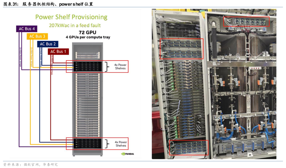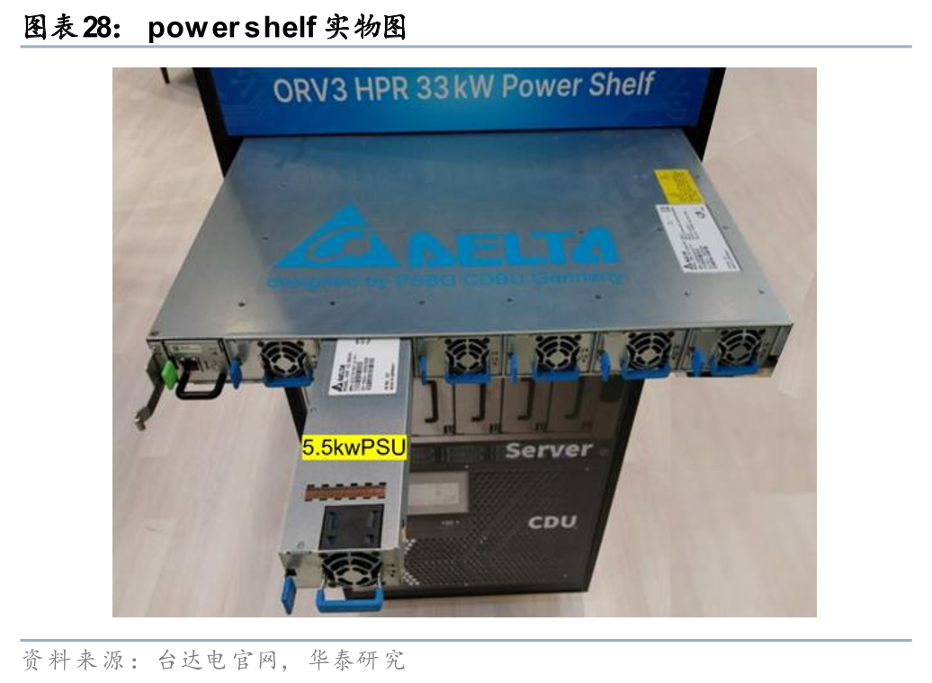 AI升级带来AC/DC电源出货形态变化:区别于传统服务器机柜中CRPS单个电源模块的出货形态,英伟达NVL36/72机柜中以power shelf(机框电源)为AC/DC电源的产品出货形态。一个power shelf由6个PSU(单电源模块,Power Supply Unit)与1个电源监控单元组成。PSU主要由输入整流滤波电路和功率因数校正电路等部分组成。据华经产业研究院,2023年全球普通服务器电源、AI服务器电源占比分别为约80%、约20%。