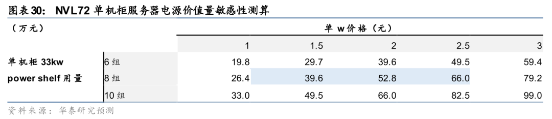 单机柜服务器电源量价测算:量方面,相比8卡服务器单机柜服务器电源功率小于20kw,英伟达NVL72单机柜或配置8组power shelf,对应单机柜电源功率264kw。价方面,我们假设单瓦价值量由0.5元提升至1.5/2/2.5元,对应单机柜服务器电源价值量由小于1万元提升至39.6/52.8/66.0万元。