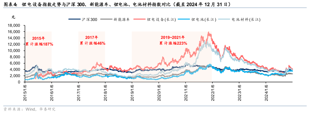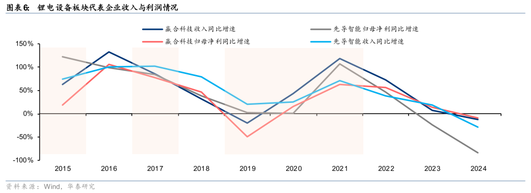 复盘过去十年(2015~2024年)锂电设备板块行情走势,我们发现板块共经历三轮大行情,分别为2015年、2017 年、2019~2021 年。