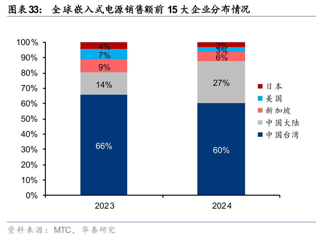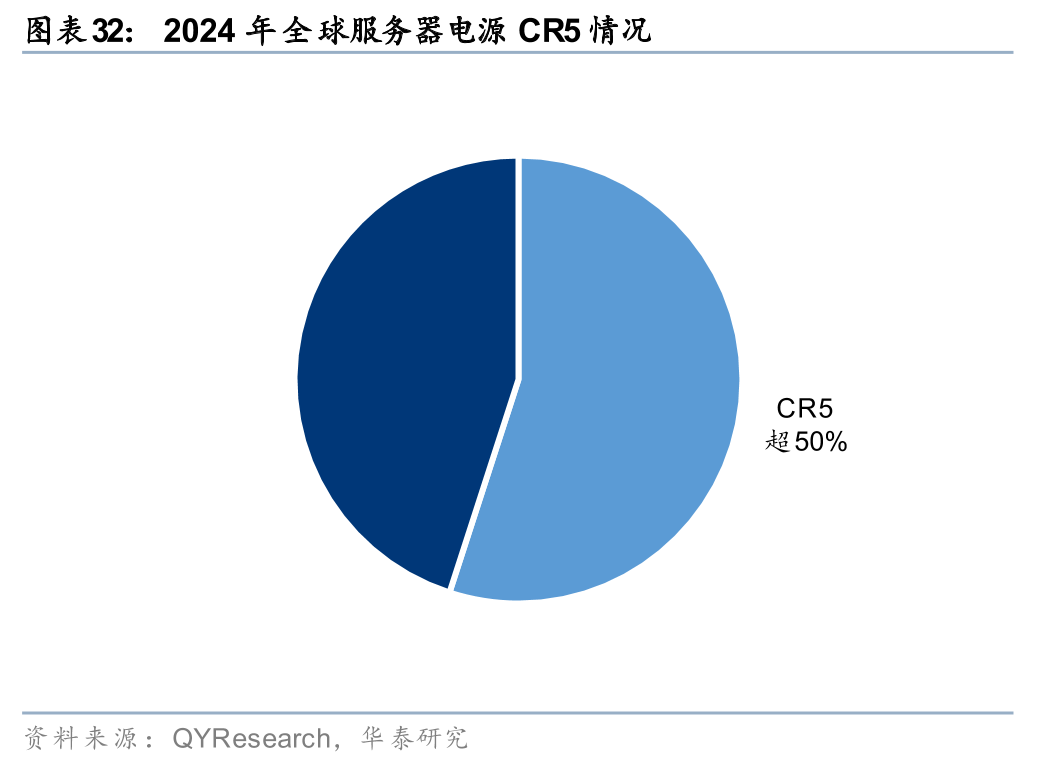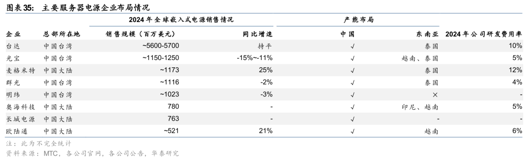 全球服务器电源市场由中国企业主导(其中台资企业表现领先),市场集中度较高,中国大陆企业加速突围。据QYResearch,2024年台达、光宝等全球服务器电源前五大厂商市场份额合计超50%,集中度较高。据MTC,全球嵌入式电源销售额前15大企业中中国大陆企业数量从2023年3家提升至2024年6家,中国大陆企业销售额占比从2023年约14%提升至2024年约27%,大陆企业竞争力提升明显。分市场来看,在海外,台达、光宝等中国台资企业占据主要市场份额。在国内,服务器电源的主要供应商包括台达、光宝、欧陆通、长城电源等,中国大陆系电源厂商正在加速提升市场份额。