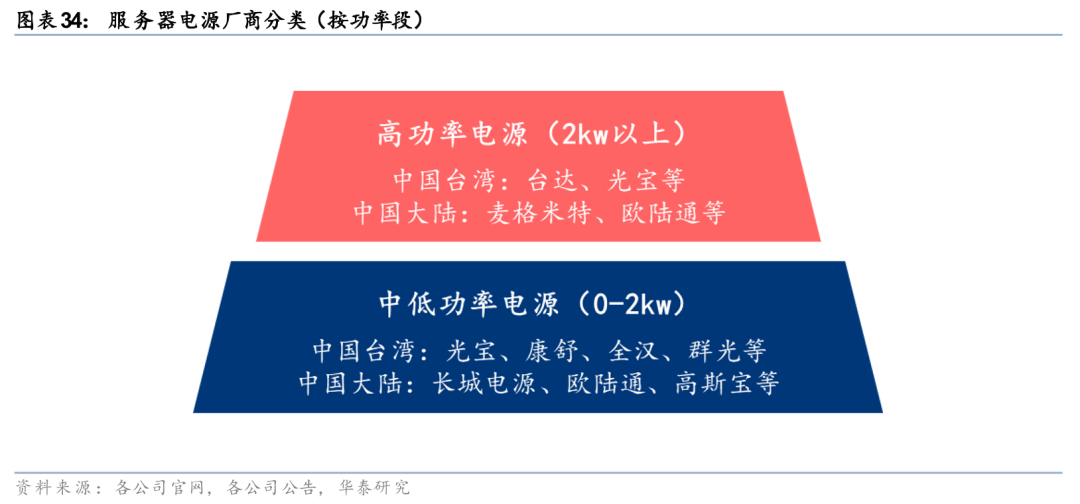 服务器电源厂家按功率段呈现分化。按照服务器电源的功率,可以将市场分为中低功率段(0-2kw)与高功率段(2kw以上)。中低功率段入门槛相对较低,技术含量相对较低,价格竞争激烈,主要企业有中国台湾的光宝、康舒、全汉、群光等,中国大陆的长城电源、欧陆通、高斯宝等。高功率段,技术含量与品质要求相对较高,在AI投入力度加大背景下需求持续增加,主要企业有中国台湾的台达、光宝等,中国大陆的麦格米特、欧陆通等。
