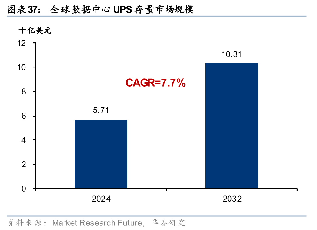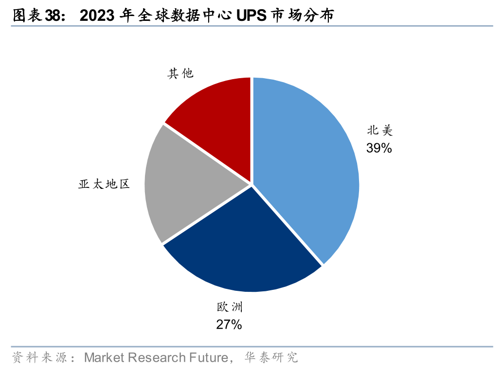 数据中心建设带动UPS需求增长,欧美市场数据中心UPS市场规模较大,中国等地区市场规模增速较快。UPS广泛应用于数据中心、电信、工业、金融、政府、医疗等领域,其中数据中心是增长较快的领域。据Market Research Future预测,2024/2032年全球数据中心UPS存量市场规模分别为57.1/103.1亿美元,2025-2032年CAGR约7.7%;分地区来看,2023年北美、欧洲占比排名前二,分别为38.5%、27.2%;预计2024-2032年亚太地区复合增速最快,特别是中国、印度、日本等地。