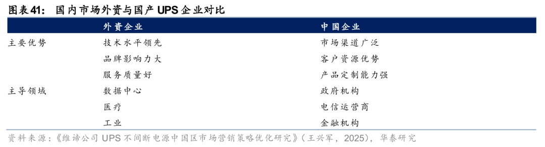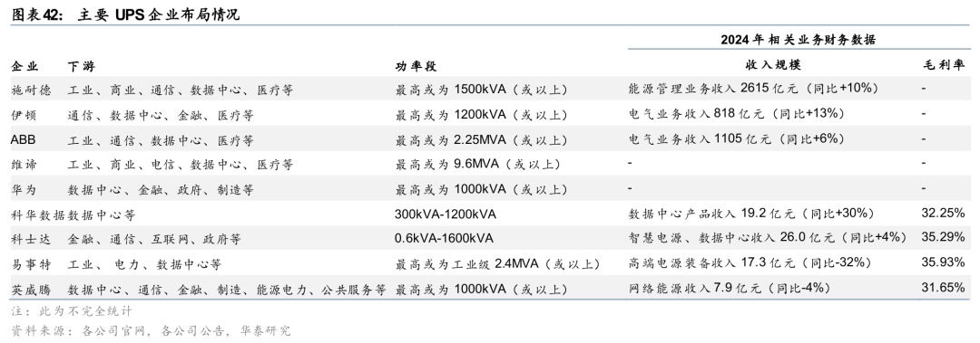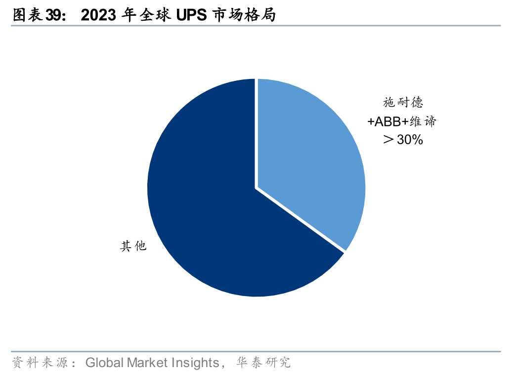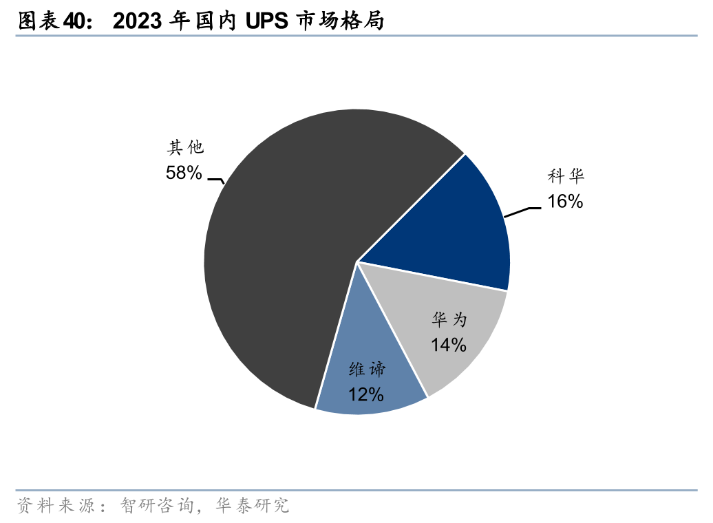 UPS产品起源于海外,外资品牌在全球市场中占据较高份额。在全球市场,UPS主要厂商包括施耐德、ABB、维谛、伊顿等,倾向于提供全链条型解决方案。据Global Market Insights,2023年施耐德、ABB、维谛全球市场份额合计超30%。在国内市场,UPS主要厂商包括华为、科华数据、维谛、伊顿等,据智研咨询,2023年CR3超过40%(科华/华为/维谛的市占率分别为16%/14%/12%)。对于互联网这一细分下游(包括数据中心),国内主要供应商为华为、伊顿、维谛等。