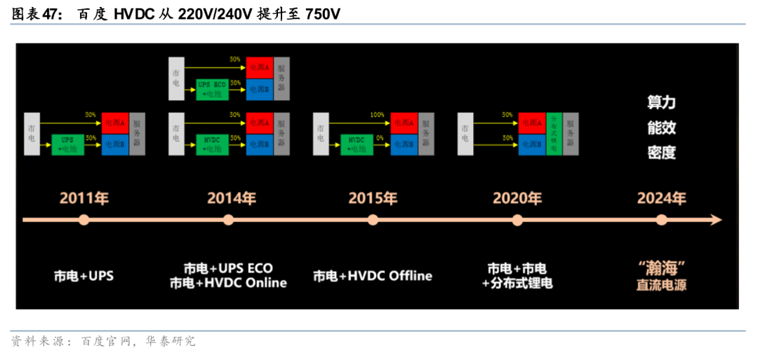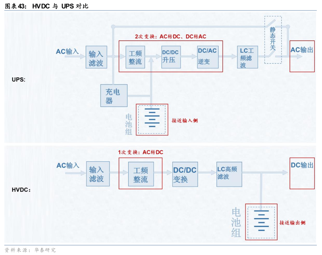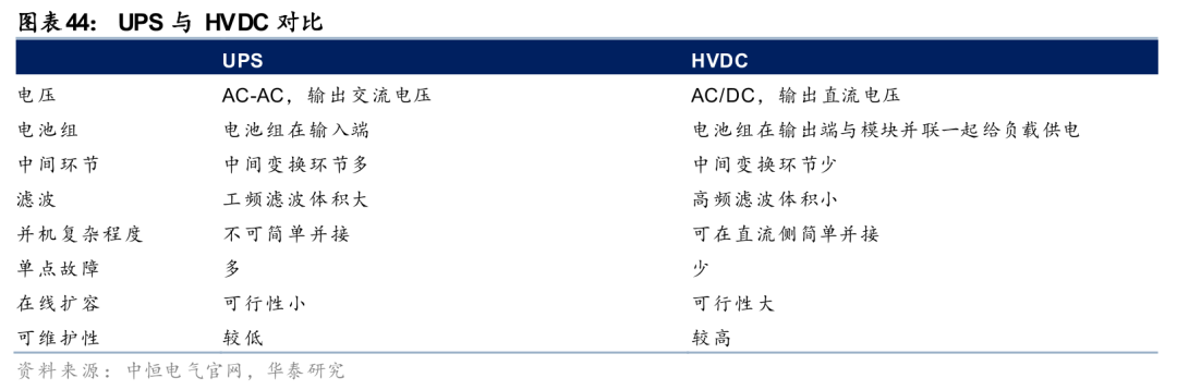 在现有基础设施和供电稳定要求的使用成熟度偏好下,当前HVDC 在数据中心的渗透率相对较低,UPS仍为主流;HVDC有望随着AI服务器单机柜功率提升而加速渗透。目前HVDC渗透率仍然较低,主要系一方面,由于供电特殊性,采用HVDC时需对后端设备进行直流改造;另一方面,HVDC需定制开发,降低了产品标准化程度、流通性,难以满足托管模式数据中心对通用性电源方案的需求。随着AI算力需求推动服务器机柜功率持续提升,用电量大幅提升,HVDC在高效传输与经济性上的潜力有望逐步释放、提升渗透率。