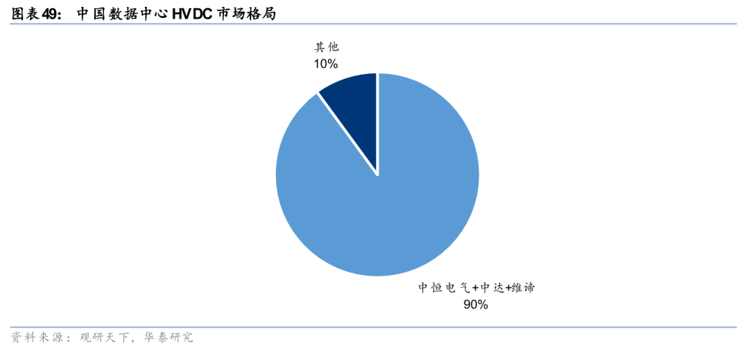 中国企业主导国内市场(呈现寡头垄断格局),积极向海外市场延申。国内市场HVDC主要厂商包括中恒电气、中达(台达大陆子公司)、维谛等,据观研天下,上述三家企业合计市场份额达90%。海外市场的主要厂商包括台达、维谛、伊顿等,中国企业正在积极开辟海外市场。对比中国与海外企业,中国企业在800V电压等级加速突破,有望凭借国内市场应用经验、性价比、生产配套能力抢占市场份额。