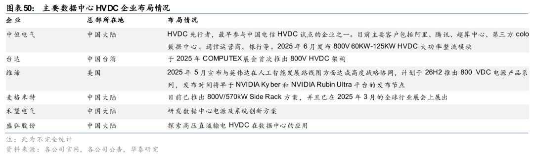 2)海外:英伟达高功率芯片的迭代有望驱动HVDC在海外市场的渗透率提升,以±400V/800V方案为主。英伟达推出了一系列高性能GPU,带动单机柜功率持续提升,将从kW级提升至MW级及以上。传统48V系统承载1MW功率需超18kA电流,而采用±400V或800V HVDC方案,将大幅降低电流,可提升可靠性、降低损耗。目前英伟达已联合纳微半导体、德州仪器、维谛、台达等厂商开发800V HVDC系统。同时谷歌、META、微软等云厂商对于±400V HVDC方案已有规划。随着后续高功率芯片放量,海外市场HVDC渗透率将加速提升。