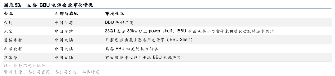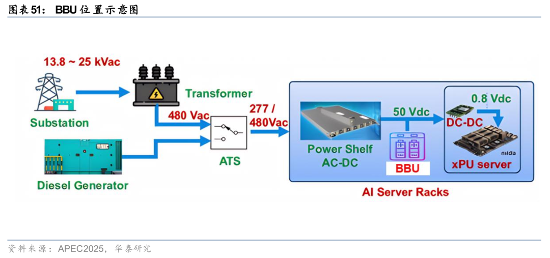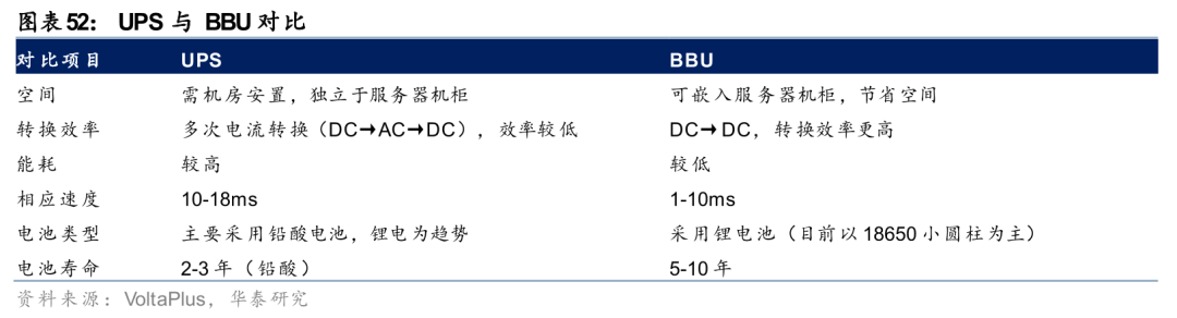 较UPS,BBU的优势主要体现在体积小、配置灵活、瞬时反应。第一,不同于UPS位于服务器机柜外,BBU体积小、可以安装在服务器机柜内,灵活性更高,且与HVDC结合可以形成“In-rack”方案节省空间。第二,不同于UPS主要采用铅酸电池,BBU主要采用锂电池,高瞬时放电能力能够提供毫秒级响应,且使用寿命更长。此外,相比传统UPS,BBU转换环节更少,转换效率高、能耗较低。