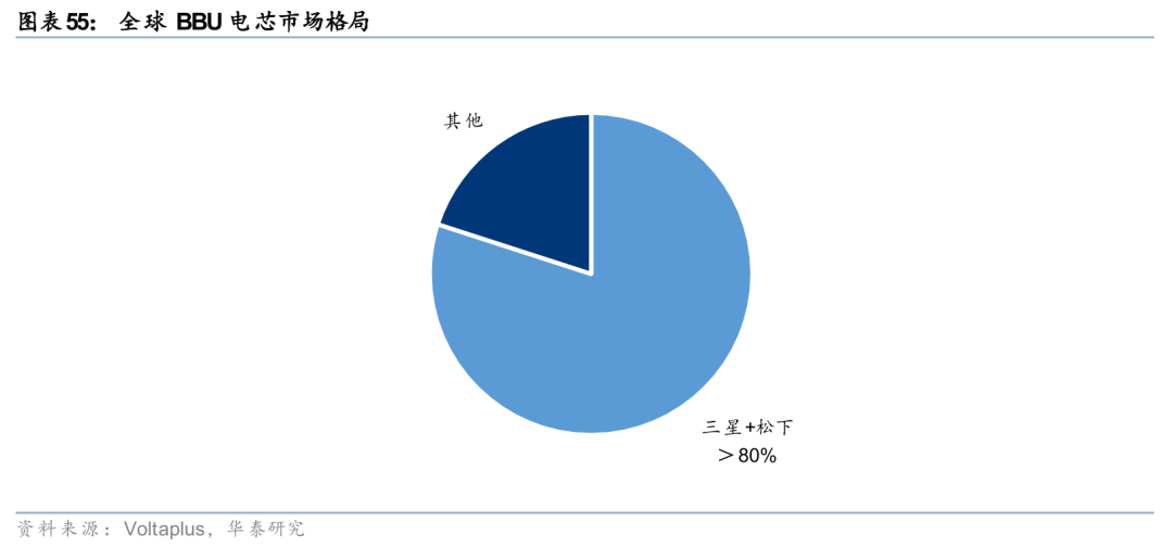 电池为BBU的主要成本构成之一,电芯环节国产化率或逐步提升。从产业链来看,电芯厂出货电芯后,由PACK企业制成电池产品出货给电源厂商集成。在电源与PACK环节,目前由中国台湾企业主导。在电芯环节,目前由日韩企业主导,据Voltaplus,三星与松下市场份额合计超80%。当前电芯环节处于产品迭代阶段(单颗电芯的功率由约60-70W提升至150-200W(2Ah向4-5Ah演进),电池规格由18650迭代至21700,引入全极耳等新技术),大陆企业或凭借电池领域技术优势逐步提升国产化率。