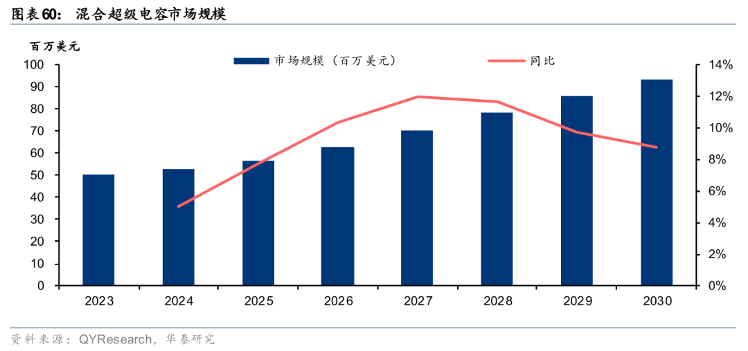 随着单个服务器机柜的功率提升,海外市场或引入超级电容作为电池备份单元核心组件,带来市场需求增加。市场规模方面,据QYResearch,2023年全球混合超容市场规模50.19百万美元,预计2030年将达到93.61百万美元,CAGR为10.05%。