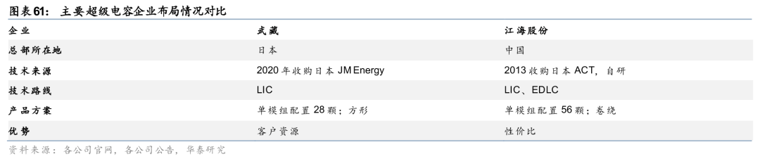 目前数据中心超级电容供应企业较少,供需紧张背景下国产企业有望凭借性价比优势提升全球市场份额。市场格局方面,目前数据中心的超级电容的供应商较少,主要包括日本武藏、江海股份等。对比日本武藏、江海股份,日本武藏的优势在于客户资源,可以更早跟随客户需求启动量产出货。江海股份的优势在于可以提供较好的产品性能与较低的价格。国产企业有望随着海外需求起量,在现有供应商供不应求的窗口下逐步提升份额。