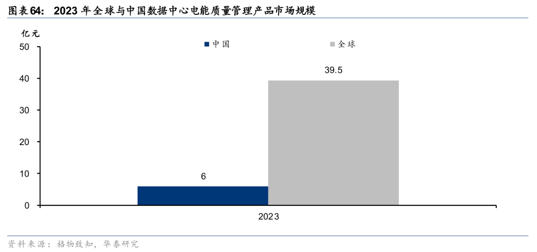据格物致知,2023年全球数据中心电能质量管理产品市场规模为39.5亿元。分地区来看,中国为6.0亿元。随着数据中心机架数量和装机功率不断扩大,电能质量管理产品的性能要求(如引入碳化硅材料)与价格有望随之提升,量价齐增带动市场规模快速增长。
