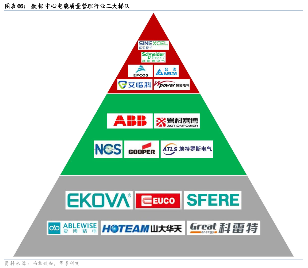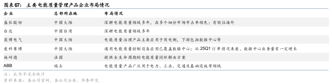 国内品牌在国内市场占据主导地位,在海外市场积极缩小与外资品牌差距。数据中心电能质量管理厂商可以分为三个梯队,第一梯队为以盛弘股份、艾临科、台达、英博电气等为代表的国产厂商,常见于三大运营商、互联网IDC等数据中心用户的供应商名单;出海项目中盛弘股份参与较多。第二梯队为以ABB、爱科赛博、诺企、库柏、埃特罗斯等为代表的厂商,在外资数据中心、Colo、区域数据中心有较多应用。第三梯队为以欧高电气、山大华天、广州阿珂法、爱博精电、斯菲尔等为代表的厂商,主要在区域数据中心较为活跃。国内品牌在巩固国内市场的基础上积极拓展海外市场,随着国产产品技术提升和性价比优势凸显,有望提升在东南亚等新兴市场的数据中心建设中的市场份额。