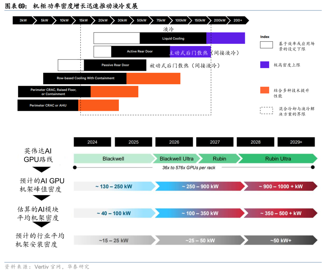 数据中心冷却系统分为风冷和液冷。风冷是数据中心主流选择,但随着AI训练服务器集群的密度增加以及GPU数量需求增长带来热功耗的上升,风冷逐渐无法满足AI数据中心的散热需求。在合理设计的情况下,风冷能支持平均约20kW的机架功率密度。然而单个8-10U的AI服务器功耗可达12kW,同时大型AI集群中的服务器因距离过长会有延迟问题无法分散部署来降低机架密度,使得风冷难以满足功率密度超20kW的AI集群需求。据维谛估计,目前液冷渗透率已接近20%。