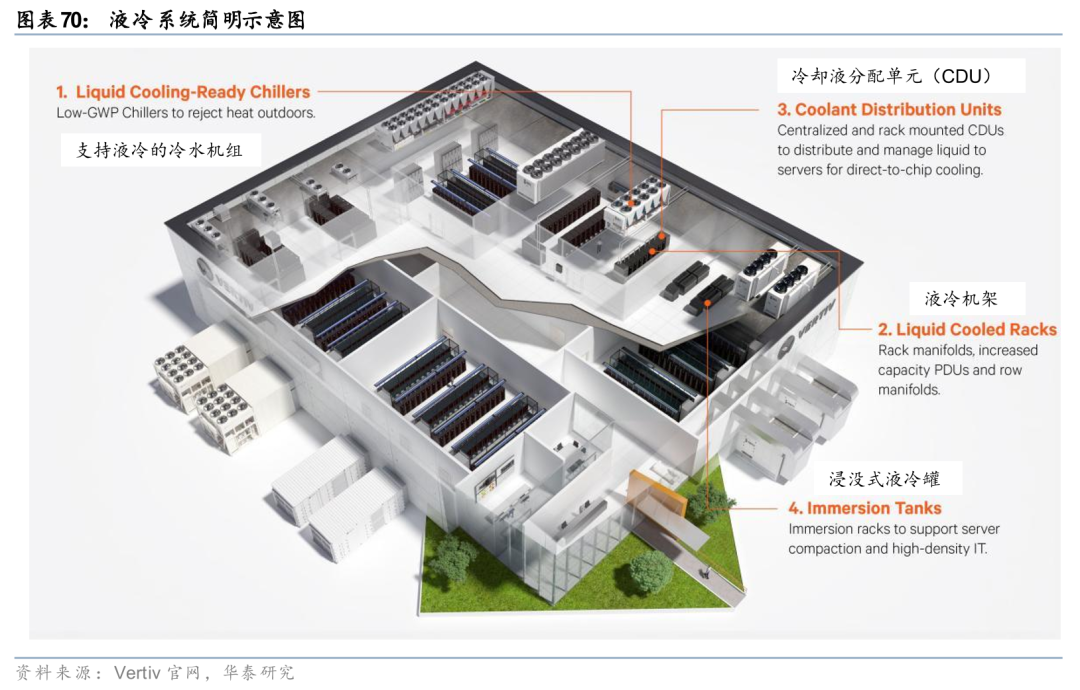 按热量传导顺序通常包括机柜、CDU(冷液分配单元)、排热设备,部分数据中心采用浸没式方案,会配备浸没液冷罐。冷板式机柜装有冷却板;CDU为液冷系统提供可控的冷却液,创建了一个独立于冷冻水供应的隔离二次回路,能够对液冷系统进行严格的控制和精确的调节;CDU连接到排热设备将热量排至室外,如建筑物的冷冻水系统或冷却塔进行最终散热。