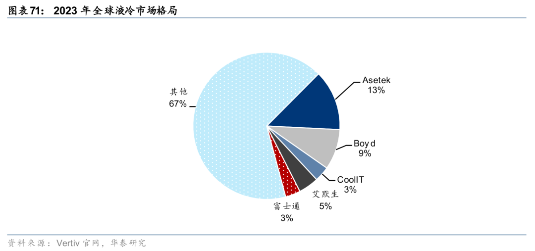 IT和电子通信为液冷下游份额最大领域,当前市场格局较为分散。据Global Market Insights统计,IT和电子通信行业在2023年全球市场占据液冷需求27%,为下游需求最大的行业;2023年,全球液冷领域市占率前五分别为Asetek、Boyd、CoolIT、艾默生、富士通,CR5约30%-35%。国内液冷温控解决方案公司主要包括英维克、申菱环境、高澜股份、同飞股份等。