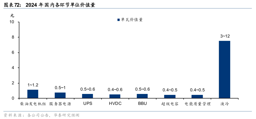 按单瓦价值量进行排序,以国内市场2024年为例,我们估算液冷(3~12)>柴油发电机组(1~1.2)>服务器电源(0.5~1)>UPS/BBU(0.5~0.6)>HVDC(0.4~0.6)>超级电容/电能质量管理(0.4~0.5)。其中,BBU、超级电容为服务器机柜层面的非标配产品。