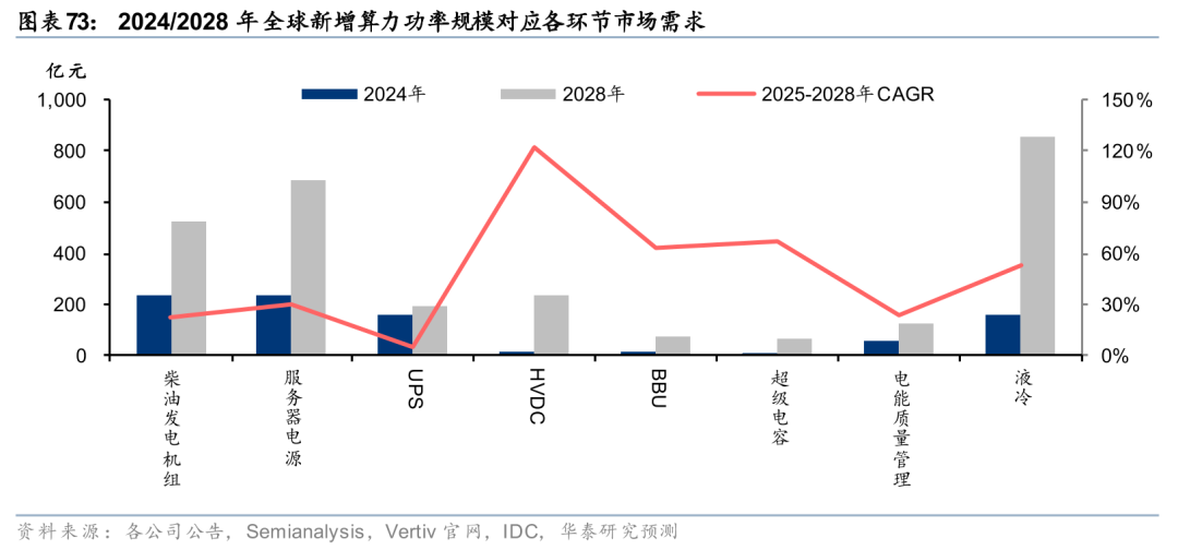 1)供配电系统:AI算力带来的数据体量大幅提升推动数据中心对于供电的稳定性、可靠性、持续性等要求提升,电力需求扩容,涉及到柴油发电机组、服务器电源、UPS、HVDC、BBU、超级电容、电能质量管理等硬件。我们测算2024/2028年全球数据中心柴油发电机组、服务器电源、UPS、HVDC、BBU、超级电容、电能质量管理的新增需求规模分别为232.5/526.0亿元、237.0/688.0亿元、159.5/192.8亿元、9.5/231.2亿元、10.1/72.0亿元、7.9/61.9亿元、54.8/126.6亿元,2025-2028年CAGR分别为23%、31%、5%、122%、64%、68%、23%。