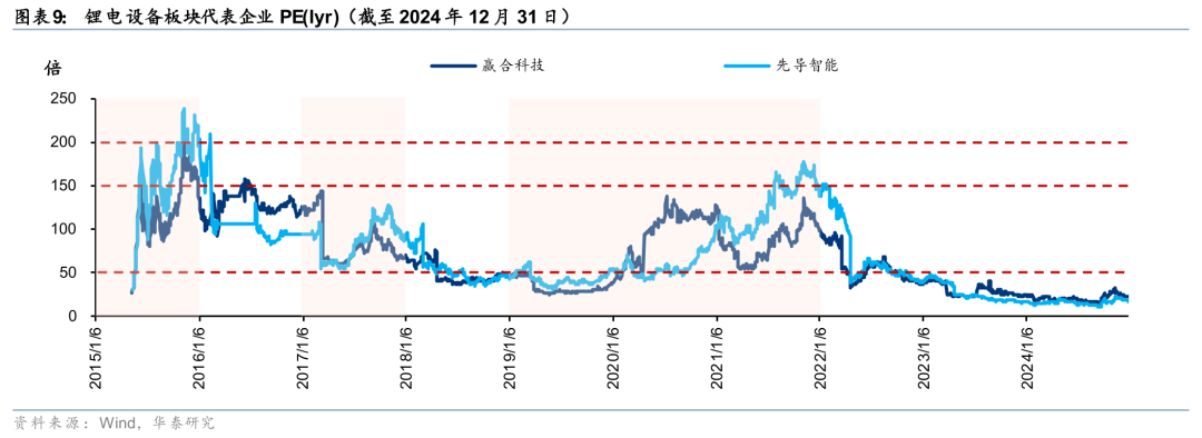 从PE(lyr)水平来看,2015~2021年锂电设备板块普遍位于50~200倍区间。在过去十年三轮大行情中,锂电设备板块代表企业的PE分别位于50~250、50~150、50~200倍区间。2022~2024年,在下游需求增速放缓的背景下,PE逐步回落至15~20倍区间。