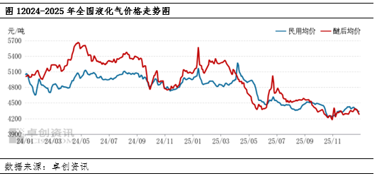 进入到12月国内液化气价格走势先涨后跌,民用气涨幅显著高于醚后碳四。其中民用气月均价4395元/吨,较上月涨75元/吨,涨幅1.74%;醚后碳四月均价4336元/吨,较上月涨19元/吨,涨幅0.43%。价格走势受供需矛盾主导,民用气上旬受沙特CP价格上涨推高进口成本、船期延后引发局部供应紧张的双重影响上行;中下旬下游化工装置亏损、对高价原料接受度下降,叠加1月CP预期回落,成本支撑减弱,价格走弱。醚后碳四受国际原油波动提振有限,主产区供应由紧转松,下游需求先降后小幅回升,供需偏紧支撑价格筑底反弹,但下游调油产品疲软、装置亏损导致成本传导受阻,卖方让利出货,价格整体低位震荡。