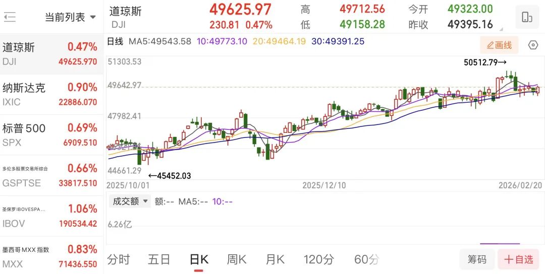 当地时间2月20日,美股三大指数集体低开,盘中直线拉升翻红。截至发稿,道指涨0.23%,纳指涨0.93%,标普500指数涨0.54%。