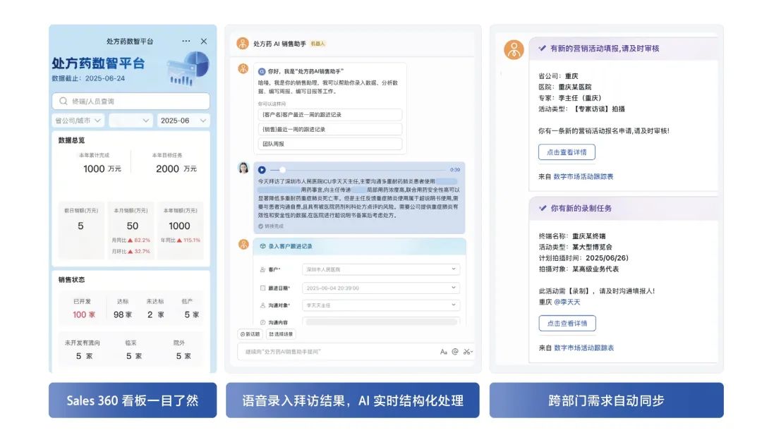 这套销售方法论正在许多先进药企转化为实战成果。在《医疗健康AI实践手册》中,某领先制药企业销售团队通过飞书构建的AI智能体改变了作战模式——销售代表在医院现场语音反馈拜访细节,AI会将录音转化为结构化报告归档系统;管理者打开销售看板即可实时监控各终端销售潜力与拜访进度。这场由AI助力的销售管理变革,正让药企从“碎片化执行”迈向“数据同频决策”的新战场。