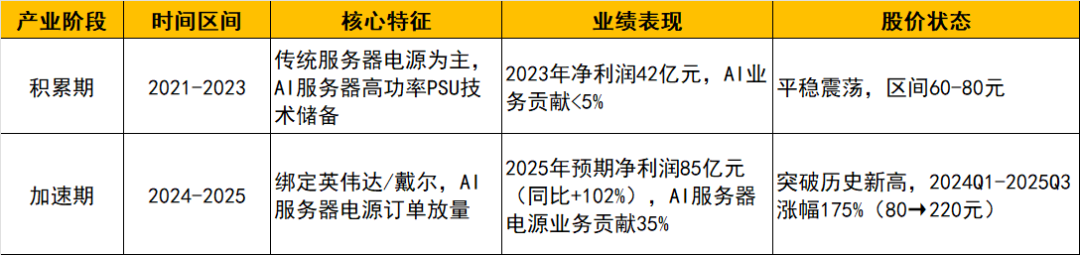 加速期:2024-2025年,绑定英伟达及CSP客户,AI服务器电源订单放量;2025年预期净利润85亿元(同比 102%),预计AI服务器电源业务贡献35%;突破历史新高,2024Q1-2025Q3涨幅175%(80→220元)。
