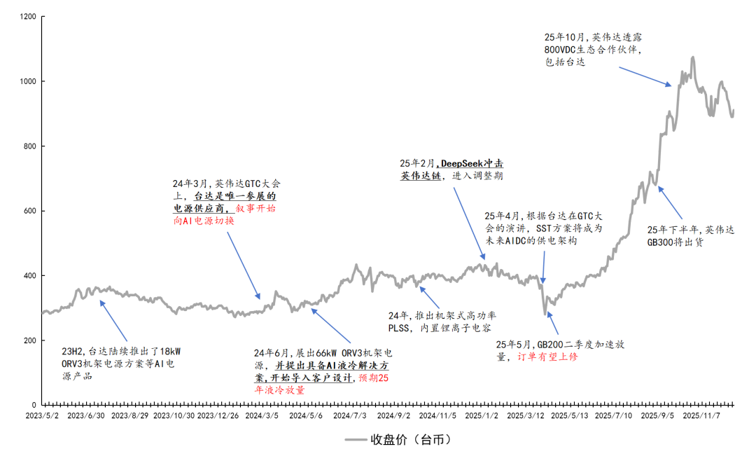 24年3月-7月:AI预期推动PE上升(25X→30X ),股价升至400 新台币。英伟达3月发布GB200,台达作为核心供应商,有望获得AI电源及散热订单,估值向AI叙事切换。 24年7-12月:股价维持在400新台币左右,业绩逐步兑现。服务器电源及散热产品需求强劲,Q3 EPS达4.75台币,北美 CSP 大厂持续在增加资本支出(CAEPX),台达电能够持续受惠。 25年4月-11月:PE与EPS同步上升,股价升至1000 新台币。AI下游需求旺盛,PE从20X→50X ,同时EPS快速增长至Q3的7.16台币。