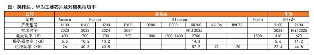 AI技术快速发展推动GPU的功耗快速增长,如英伟达2020年推出的A100芯片功耗为400W,2022年推出的H100芯片功耗上升至700W,2024年发布的下一代B200芯片功耗将接近1000W。芯片功率密度的攀升同时带来整柜功率密度的持续增长: