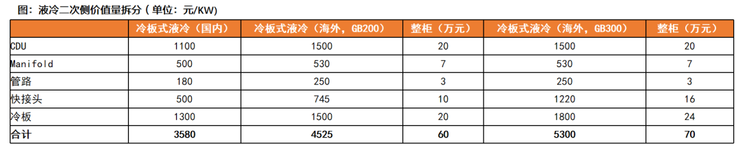 冷板:GB200组成的NVL72冷板单价约450美元/片、大面积冷板设计,单机柜冷板需求量45片;GB300设计方案改为每个GPU芯片配备独立“一进一出”液冷板,提升散热均匀性与模块化扩展性,对应预计冷板单价300-350美元/片、单机柜冷板需求量108片。对应冷板单位价值量由GB200的约1500元/KW提升至GB300的1800元/KW。 快接头:GB200方案的快接头单价130美元/对,单机柜108对;GB300方案的快接头单价70美元/对,单机柜用量上升至216对。对应冷板单位价值量由GB200的约750元/KW提升至GB300的1200元/KW。 CDU:单位价值量与散热功率密度有关,目前国内价值量约1100元/KW,海外1500元/KW;我们预计未来单机柜功率的持续提升将带动CDU价值量向上。