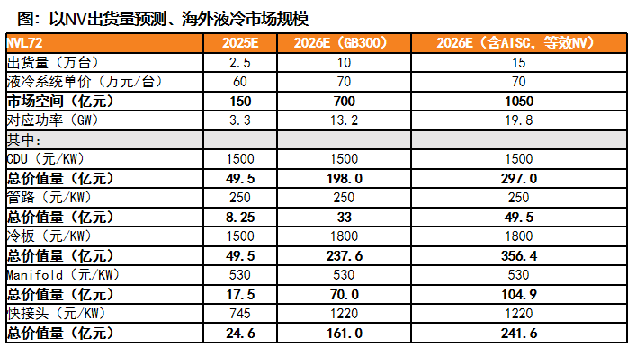 国内:2026年新增数据中心装机10GW、液冷渗透率达到50%,对应市场空间达到150亿元、yoy 79%; 海外:我们预计2026年NVL72出货10万台,叠加ASIC等其他服务器需求,我们预计2026年海外液冷市场空间将达1050亿元。其中,我们预计CDU、管路、冷板、Manifold、快接头市场空间将分别达178/30/214/63/145亿元。GB300 NVL72中,冷板、快接头价值量变化最大:1)冷板:GB300设计方案每个GPU芯片配备独立液冷板,对应预计冷板单价300-350美元/片、单机柜冷板需求量从GB200的45片上升至108片。2)快接头:GB300方案的快接头单价70美元/对,单机柜用量从GB200的108对上升至216对。3)CDU:冷却介质变化(如单相→相变→浸没式),预计未来单机柜功率的持续提升将带动CDU价值量向上。