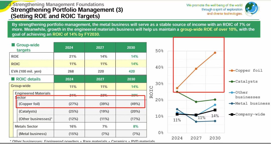核心结论:1)HVLP:25年开始高增速,利润率25-27年大幅提升;2)三井对载体铜箔重视度更高。 铜箔产品:半导体封装基板(PKG)、高密度连接板(HDI)、HVLP、半导体材料等 未来展望: 1)ROIC:预计铜箔24/27/30年分别在27%、39%、49%,我们认为这说明盈利能力有望大幅提升,验证高端铜箔升级迭代趋势。 2)销量增速:HVLP 2代及以上25年增速93%,25-27年复合增速13%。 3)产能规划:25-27年规划中提到增加HVLP中国台湾地区工厂产能,马来工厂开始生产。