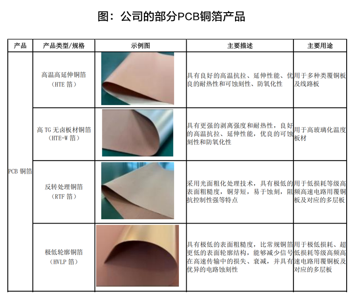公司主要从事各类高精度电子铜箔的研发、制造和销售,其PCB铜箔产品主要有高温高延伸铜箔(HTE 箔)、反转处理铜箔(RTF 箔)、高 TG 无卤板材铜箔(HTE-W 箔)和极低轮廓铜箔(HVLP 箔)等。 公司在PCB高端铜箔领域产能布局合理,产品技术领先。公司已掌握多项铜箔核心技术,特别是公司高频高速用 PCB 铜箔在内资企业中具有显著优势,其中 RTF 铜箔产销能力于内资企业中排名首位,HVLP1-3 铜箔2025H1已向客户批量供货,产量同比持续增长,HVLP4 铜箔正在下游终端客户全性能测试,载体铜箔已掌握核心技术,正在准备产品化、产业化工作。