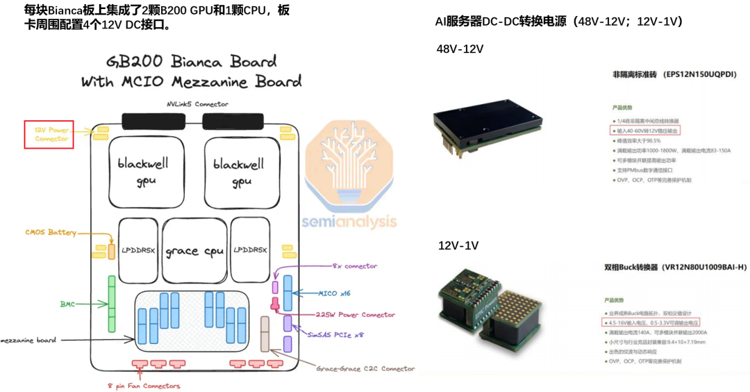 随着AI驱动服务器的持续增长,数据中心正在采用更高功率的供电架构。例如,基于Hopper架构的AI服务器通常使用3kW的电源模块,而采用Blackwell架构的AI服务器已转向5.5kW电源。