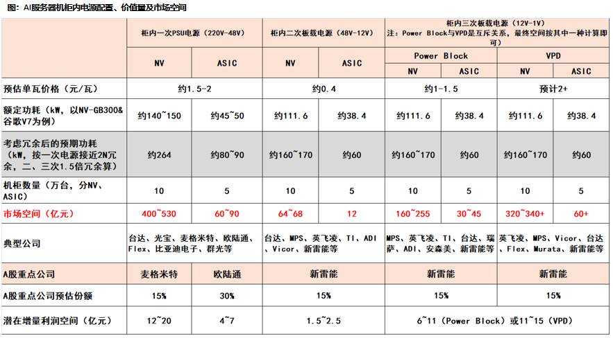 技术迭代升级带来价值量提升:对于柜内一次电源,PSU 功率正经历从 5.5kW到 12kW 的跃升;我们认为新产品功率密度及转换效率的持续提升,有望带来单价提升。而垂直供电架构、GaN高密度方案,正逐步重构板载DC电源的设计逻辑,我们认为这种技术和材料的升级有望带来价值量的提升。