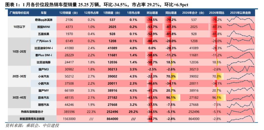 1月中汽协口径国内新能源车销量94.5万辆,同/环比 0.1%/-44.8%;乘联会口径新能源乘用车批售86.4万辆,同/环比-2.8%/-44.7%,渗透率43.8%,环比-12.3pct。级别方面,1月B级及以上新能源乘用车零售销量占比环比 5.0pct至63.4%,主要系新以旧换新政策下乘用车销量向中高级别提速;A级占比环比-2.6pct至22.5%;A0 A00占比环比-2.5pct至14.0%。新能源乘用车出口30.2万辆,同比 100.5%,环比 0.5%,创1月历史新高,海外需求持续旺盛。2026全年销量预期1870万辆,同比 13.7%。