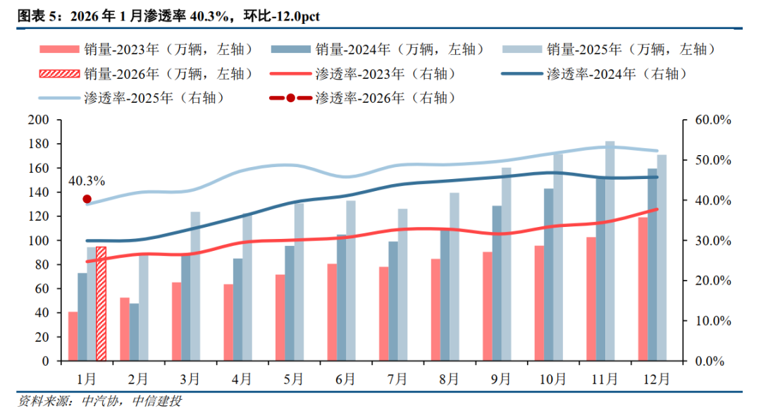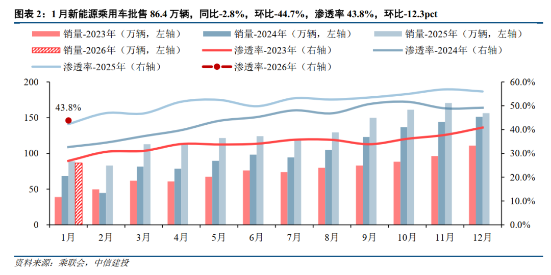乘联会口径:26年1月新能源乘用车批售86.4万辆,同比-2.8%,环比-44.7%;渗透率43.8%,环比-12.3pct;零售59.6万辆,同比-19.9%,环比-55.4%;渗透率38.6%,环比-20.5pct;出口28.6万辆,同比 105.8%,环比 4.8%;渗透率49.7%,环比 3.2pct。