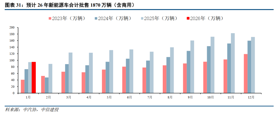 2025全年中国新能源车销量1644.4万辆(含商用),同比 27.9%。我们预测2026年全年销量1870万辆(含商用),同比 13.7%。