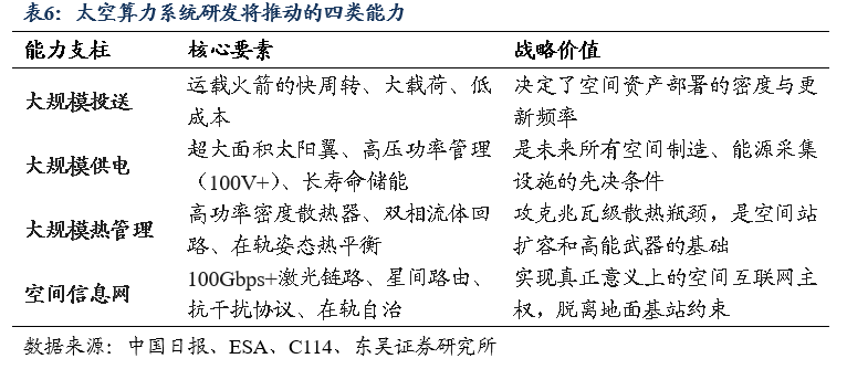 工程挑战与竞争格局:物理瓶颈下的全球战略博弈。尽管物理优势显著,但太空算力的规模化落地仍受限于抗辐射技术、通信链路及在轨维护等硬瓶颈。商用芯片(COTS)在极端环境下易发生逻辑翻转,需通过系统级容错与硬件加固对冲风险;同时,兆瓦级算力产生的巨大散热需求对航天器的结构疲劳与指向控制提出了极高要求。目前,全球竞争格局呈现两种路径:以SpaceX为代表的激进路线试图通过“星舰”的低成本运力实现轨道算力的商业闭环,支撑其高估值叙事;而中国路径则更加稳健,侧重于通过边缘算力锻炼大功率电源与激光路由等底层能力栈。随着技术成熟,太空算力将不仅是数字经济的新引擎,更将成为国际安全博弈与空间秩序重塑的核心变量。