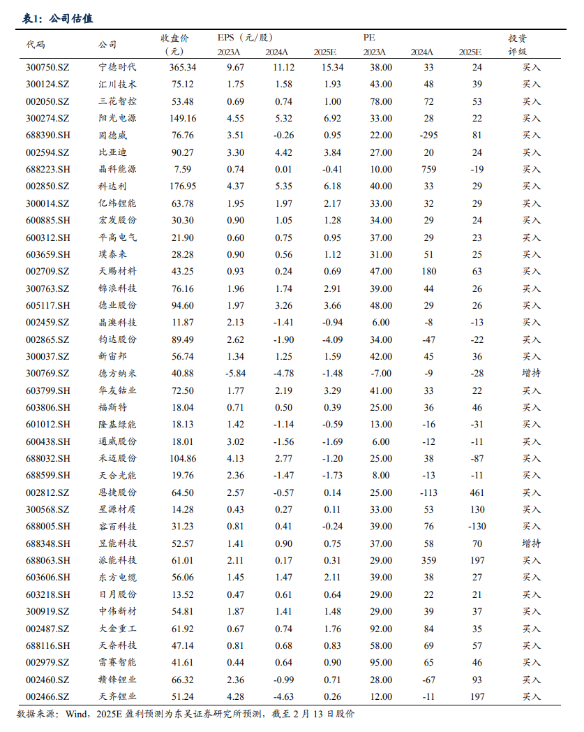 投资建议:宁德时代(动力&储能电池全球龙头、增长确定估值低)、阳光电源(逆变器全球龙头、海外大储集成优质龙头、切入AIDC)、思源电气(电力设备国内出海双龙头、订单和盈利超预期)、三花智控(热管理全球龙头、特斯拉机器人总成空间大)、恩捷股份(湿法隔膜龙头、盈利修复有望超预期)、科达利(结构件全球龙头稳健增长、谐波为核心的人形零部件总成潜力大)、亿纬锂能(动力&储能锂电上量盈利向好并走出特色之路、消费类电池稳健)、明阳智能(风机盈利大拐点、太空光伏想象空间大)、天赐材料(电解液&六氟龙头、六氟涨价超预期弹性大)、福斯特(胶膜龙头、布局太空封装膜)、湖南裕能(铁锂正极龙头强、高端产品供需紧张涨价在即)、鼎胜新材(铝箔龙头业绩超预期、纳电受益)、钧达股份(光伏电池龙头、入股尚翼布局太空光伏)、浙江荣泰(云母龙头增长确定、丝杠及总成大客户进展迅速)、伟创电气(工业自动化稳步增长、人形机器人进展顺利潜力大)、德业股份(新兴市场开拓先锋、户储爆发工商储蓄势)、麦格米特(多产品稳健增长、英伟达供应商AIDC潜力大)、四方股份(二次设备龙头估值低、SST优势明显并大力拓展)、金盘科技(干变全球龙头海外全面布局、AIDC大力布局)、中恒电气(高压直流积累深厚、800V巴拿马电源龙头)、汇川技术(通用自动化弱复苏龙头、Alpha明显、联合动力持续超预期)、伊戈尔(变压器出海进入收获期、布局AIDC)、艾罗能源(户储工商储大储今年齐上量、盈利弹性可期)、帝科股份(银浆龙头、银包铜银浆率先量产在即)、大金重工(海风出口布局厚积薄发、量利双升超预期)、尚太科技(负极龙头份额提升超预期、成本优势大盈利能力强)、璞泰来(负极龙头盈利拐点隔膜涂敷稳增、固态电池设备&材料领先)、当升科技(三元正极龙头、固态电解质技术领先)、海博思创(国内大储龙头提前卡位优势明显、积极开拓海外储能)、厦钨新能(钴酸锂需求盈利向好、卡位硫化锂固态潜力大)、纳科诺尔(干法设备龙头、固态设备全面布局)、上海洗霸(全面布局固态、有研合资硫化锂有望领先)、阿特斯(一体化组件头部企业、深耕海外大储进入收获期)、优优绿能(充电桩模块盈利拐点、AIDC想象空间很大)、聚和材料(银浆龙头、铜浆率先布局)、震裕科技(结构件盈利逐步修复、关节总成拓展到手臂总成空间大)、华友钴业(锂电资源材料一体化布局、钴管控价格和盈利有望超预期)、赣锋锂业(自有矿比例提升碳酸锂龙头、电池初具规模)、比亚迪(电动车销量持续向好且结构升级、储能海外市场拓展顺利)、中矿资源(碳酸锂优质资源有弹性、铯铷等盈利稳健)、盛新锂能(低位积极布局锂资源、碳酸锂涨价弹性大)、隆基绿能(BC 26年上量有望率先走出周期、收购精控布局大储第二增长曲线)、中熔电气(熔断器龙头增长确定、布局高压直流等新品打造第二增长曲线)、固德威(组串逆变器持续增长,储能电池和集成逐步恢复)、艾罗能源(老牌户储龙头、工商储和大储逐步起量)、欣旺达(消费锂电盈利向好、动储锂电上量盈利在即)、宏发股份(传统继电器稳增长、高压直流和PDU持续高增长)、东方电缆(海缆壁垒高格局好,海风项目开始启动)、金风科技(风机毛利率恢复有望超预期、风电运营稳健)、富临精工(高压实铁锂领先且获宁德控股扩产、机器人布局深厚)、新宙邦(电解液&氟化工齐头并进)、天奈科技(碳纳米管龙头、快充&硅碳&固态持续受益)、星源材质(干法和湿法隔膜龙头、LG等海外客户进展顺利)、锦浪科技(欧洲去库完成逆变器迎来拐点、新兴市场销售提升提供支撑)、天合光能(210一体化组件龙头、储能开始进入收获期)、容百科技(高镍正极龙头、海外进展超预期)、北特科技(丝杠头部批量空间大、汽零平稳)、良信股份(断路器优质标的,率先切入海外AIDC供应链潜力大)、雷赛智能(伺服控制器龙头企业、机器人关节批量优势明显)、盛弘股份(受益海外和国内AI资本开支、海外储能新客户拓展)、禾迈股份(微逆去库尾声重回高增长、储能产品开始导入)、斯菱智驱(车后轴承市场稳定增长、打造谐波第二增长曲线)、三星医疗(海外配网和电表需求强劲、国内增长稳健)、隆基绿能(单晶硅片和组件全球龙头、BC技术值得期待)、爱旭股份(ABC电池组件龙头、25年大幅放量)、通威股份(硅料龙头受益供给侧改革、电池和组件有望改善)、科华数据(全面受益国内AI资本开支新周期、数据和数能双星驱动)、晶澳科技(一体化组件龙头、盈利率先恢复)、晶科能源(一体化组件龙头、Topcon明显领先)、上能电气(逆变器地面地位稳固、大储PCS放量在即)、平高电气(特高压交直流龙头、估值低业绩持续超预期)、许继电气(一二次电力设备龙头、柔直弹性可期)、国电南瑞(二次设备龙头、稳健增长可期)、中伟新材(三元前聚体龙头、镍锂金属布局可观)、福莱特(光伏玻璃龙头成本优势显著、价格底部有望企稳反弹)、三一重能、华盛锂电、天齐锂业、艾罗能源、中国西电、禾望电气、天顺风能、德方纳米、昱能科技、威迈斯、儒竞科技、派能科技、元力股份、大金重工、海兴电力、中熔电气、天齐锂业、日月股份、三一重能、金风科技。建议关注:东方电气、佛塑科技、东方日升、上海港湾、宏工科技、峰岹科技、海优新材、先惠技术、天际股