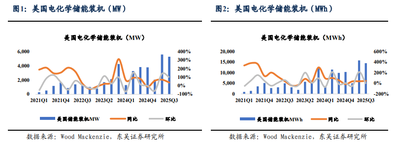 根据Wood Mackenzie数据,25Q3美国储能装机14.5GWh,同环比 38%/-8%(Q2为史上装机最高季度),25年Q1-Q3累计装机32.6GWh,同比 37%,已超过2024年全年水平。其中,Q3大储装机13.6GWh,同环比 40%/-9%;Q3工商储装机67MWh,同环比-16%/-21%;Q3户储为0.8GWh,同环比 27%/ 7%。美国大储需求旺盛,美国AI催生需求,2026年预计装机80GWh,同比增51%,数据中心相关贡献37GWh。此外,关税及大而美法案落地,25-26年发货景气度高,且目前北美本土电芯产能有限、27-28年增量有限情况下,中国供应链依然有望借势美国光储高增。