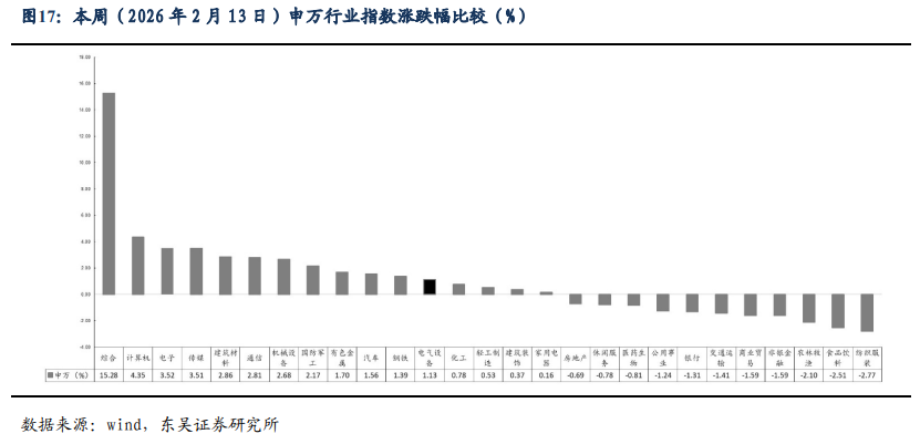 电气设备10848上涨1.13%,表现强于大盘。(本周,2月9日-2月13日,下同),新能源汽车涨2.46%,锂电池涨1.62%,发电设备涨1.2%,电气设备涨1.13%,核电涨1.11%,风电跌2.13%,光伏跌1.03%。涨幅前五为中材科技、应流股份、东方电气、智光电气、万向钱潮;跌幅前五为ST新动力、东方日升、拓日新能、中来股份、中超控股。
