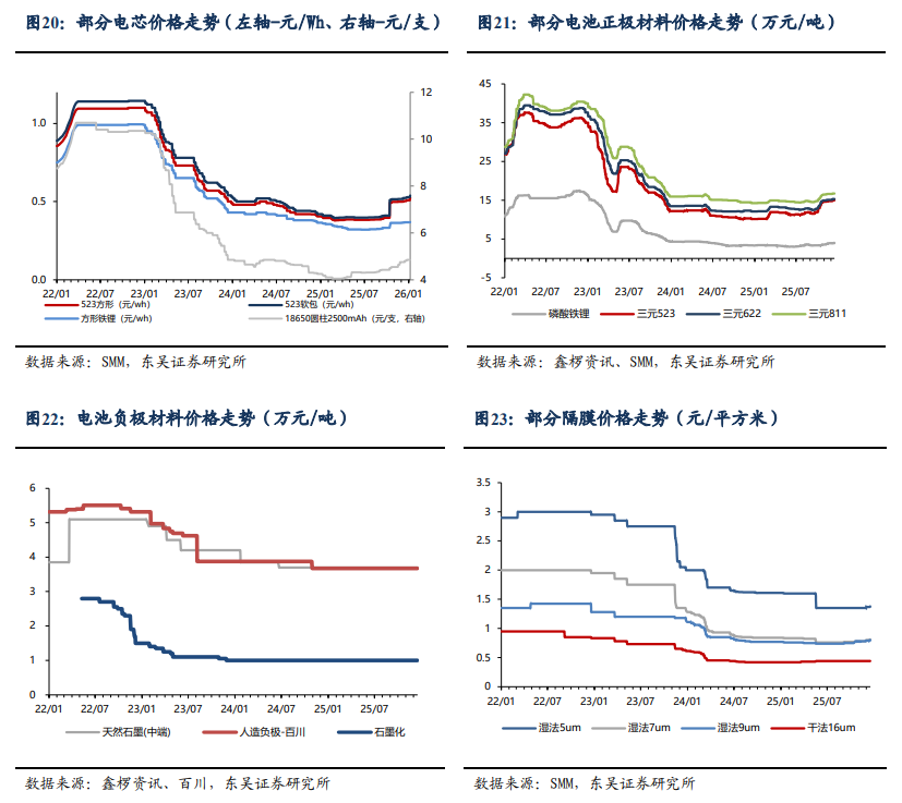 投资策略:储能:国家层面容量补偿电价出台,后续各个省将出台细则和清单,大储需求旺盛,26年预计60% 增长,美国大美丽法案后25年抢装超预期,叠加数据中心储能25Q4开始爆发,26年有望超预期,欧洲、中东等新兴市场大储需求爆发,持续高增长;欧洲户储去库完成,出货恢复,工商储需求开始爆发,新兴市场持续增长,我们预计全球储能装机26年60%以上增长,27-29年复合30-50%增长,继续强推大储,看好大储集成和储能电池龙头。锂电&固态:1月国内电动车销量94.5万辆,同环比0%/-45%,1月电动重卡销量强劲,本土乘用车销量相对疲软,预计3-4月增速恢复;1月欧洲9国合计销量20.9万辆,同环比 23%/-36%,电动车渗透率29.4%,平稳向上。排产端,2月春节影响,环比下降10% ,淡季尾声,3月目前排产预计新高,环增15% 。价格方面,电池散单价格已调至0.38元/wh,材料中小客户涨价已落地,大客户预计3月后逐步落地。当前位置,强推电池和隔膜板块,首推宁德、亿纬锂能等,重点看好恩捷、天赐、裕能、科达利、璞泰来、尚太等价格弹性和优质材料龙头标的,同时看好碳酸锂优质龙头赣锋、中矿、永兴、盛新等。另外,26Q1固态催化剂众多,龙头企业加快量产线招标,继续看好硫化物固态电解质和硫化锂及核心设备优质标的。AIDC:海外算力升级对AIDC要求持续提升,高压、直流、高功率趋势明显,SST有加速趋势,国内相关公司迎来出海新机遇,继续看好有技术和海外渠道优势的龙头;机器人:Tesla Gen3将于26年Q1推出,27年推向市场,2030年依然预期100万台;人形公司产品、订单、资本端等进展提速,25-26年国内外量产元年共振,全面看好T链确定性供应商和头部人形核心供应链、看好总成、灵巧手、丝杠、谐波、传感器、运控等核心环节。工控:工控25年需求总体继续弱复苏,锂电需求恢复、风电、机床等向好,同时布局机器人第二增长曲线,全面看好工控龙头。风电:26年国内海风预计12GW ,同增50% ,三年行动计划推进中提升国内海风空间,欧洲海风进入持续景气周期,继续全面看好海风,25年陆风110GW ,同增30%,风机价格涨3-5%,风机毛利率逐步修复,推荐海缆、海桩、整机等。光伏:需求来看暂时明显偏弱,银价等大涨推动电池报价明显上涨,组件部分传导压力明显,26年需求首次下滑,太空光伏带来大增量空间可能,砷化镓、P型HJT、太空钙钛矿率先受益,musk访谈明确提出太空和地面各建100GW,设备受益、辅材受益。电网:25年电网投资增长,出海变压器高景气,看好Alpha龙头公司思源等。
