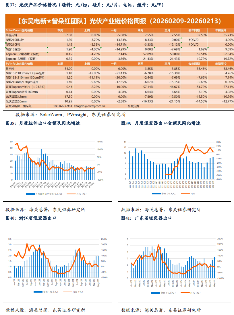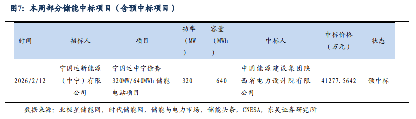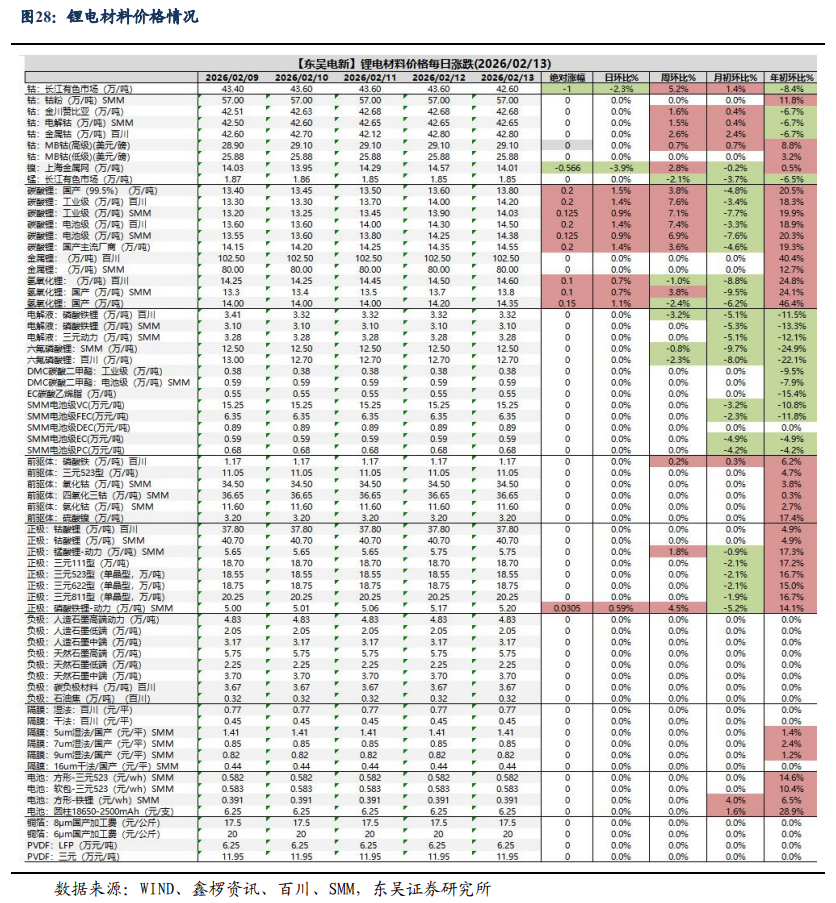 行业层面:储能:美国公布OBBB法案细则,明确MACR成本计算模式,需穿透到MP和MPC。国务院:探索报价竞争形成容量电价,≥10kV用户直接参与电力市场;2025年储能系统出货排名:Tesla、阳光、比亚迪、华为、中车为全球前五;波兰推出2026-2030年户储补贴政策,总预算10亿波兰兹罗提,针对高于12kWh的户储系统,目标补贴6.25万台。人形机器人:春晚机器人刷屏,具身智能大阅兵圆满完成;京东机器人卖爆;斯坦福发布MobileALOHA 2.0机器人。电动车:中汽协:1月国内电动车销量94.5万辆,同环比0%/-45%;乘联会:1月电动国内乘用车零售60万辆,同环比-20%/-55%,批发86万辆,同环比-3%/-45%;1月电动重卡销量2.1万辆,同环比 191%/-40%,电动化率20%;1月国内动力储能电池产量168GWh,同环比 56%/-17%;1月美国电动车销量8.4万辆,同环比-27%/-24%;特斯拉首辆Tesla Cybercab正式下线;安徽金誉拟于宜宾投资10亿建设6万吨电池铝箔产能,计划27年5月竣工;永太科技与宁德时代交易终止;鹏辉能源斥资33亿元扩产,投建587Ah/120Ah电池项目;灵鸽科技中标首条百吨级硫化物固态电解质连续化整线项目。市场价格及周环比:碳酸锂:国产99.5% 13.80万/吨, 0.5万/吨, 3.8%;工业级SMM 14.03万/吨, 0.93万/吨, 7.1%;电池级SMM 14.38万/吨, 0.93万/吨, 6.9%;正极:钴酸锂SMM 40.70万/吨, 0.00万/吨, 0.0%;磷酸铁锂-动力SMM 5.2万/吨, 0.22万/吨, 4.5%;金属锂:SMM 80.00万/吨, 0.0万/吨, 0.0%;氢氧化锂:国产SMM 13.8万/吨, 0.5万/吨, 3.8%;电池:圆柱18650-2500mAh 6.25元/支, 0.00元/支, 0.0%;方形-铁锂SMM 0.391元/wh, 0.00元/wh, 0.0%;隔膜湿法/国产SMM 1.41元/平, 0.00元/平, 0.0%;前驱体:四氧化三钴SMM 36.65万/吨, 0.00万/吨, 0.0%;六氟磷酸锂:SMM 12.5万/吨,-0.10万/吨,-0.8%;新能源:内蒙古24.5GW风、光沙戈荒外送基地获国家能源局批复;光伏组件重回1元/W时代;道达尔能源宣布与谷歌签署两份为期15年的电力购买协议,为其数据中心供给1GW太阳能发电能力。2025年各省光伏新增装机披露,新疆、江苏、广东、山东、云南领衔;2025年新增光伏装机类型:地面163GW工商业107GW户用46GW。晶澳科技与鉴衡认证签订太空光伏实证战略合作协议;中国能建签约南非单体容量最大光伏电站项目,约合单价1元/Wh!本周硅料 57.00 元 /kg,环比0.00%;N 型 210R 硅片 1.30元 / 片,环比-3.7%;N 型 210 硅片 1.45元 / 片,环比-3.33%;双面 Topcon182 电池片0.45元 / W,环比-4.26%;双面 Topcon182 组件 0.85 元 / W,环比0.00%;光伏玻璃 3.2mm/2.0mm 17.50/10.25元 / 平,环比 0.00%/0.00%。风电:本周招标0.71GW:陆上0.711GW/海上0GW;本周开/中标均价:陆风1781.27元/KW,陆风(含塔筒)2227.70元/KW。本月招标:1.71GW,同比-50.25%:陆上1.71GW,同比-50.25%,海上0GW,同比0%。26年招标:8.09GW,同比-28.65%:陆上8.09GW/海上0GW,同比-22.86%/同比-100%。本月开标均价:陆风1781.27元/KW,陆风(含塔筒)2293.30元/KW,海风(含塔筒)3176.51元/KW。电网:广东肇庆500千伏柑乡变电站投运;2025年第四季度Vertiv维谛技术每股收益为1.36美元,销售额为29亿美元,同比增长23%。