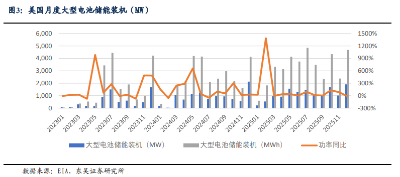根据EIA数据,美国大储12月新增装机1908MW,同环比-10%/ 89%,对应4682MWh,同环比 14%/ 97%,平均配储时长2.5h。2025年1-12月累计装机13609MW,同比 31%,对应38.8GWh,同比 39%。