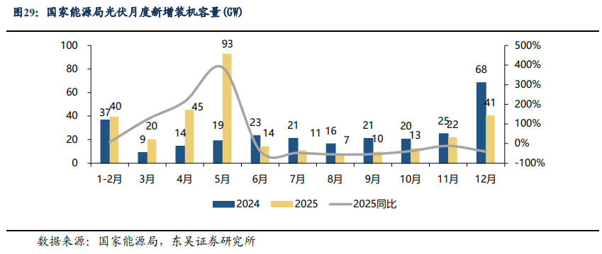 根据国家能源局统计,光伏25年12月新增40.53GW,同比-40.68%,环比 84.31%;1-12月累计315.4GW,同比 15%。
