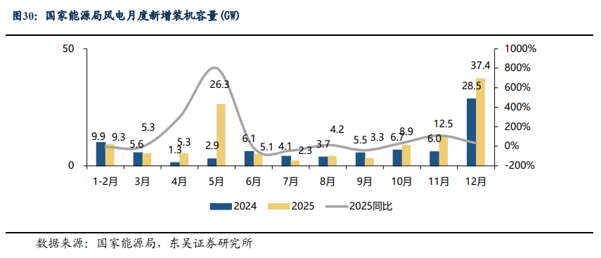 根据国家能源局统计,风电25年12月新增37.37GW,同比 31%,环比 199.2%;1-12月累计119.9W,同比 49%。