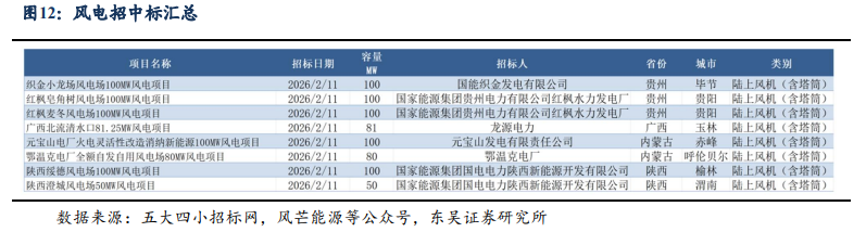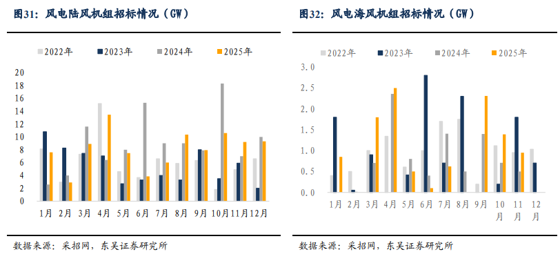 25年1~12月陆风机组招标98GW,同比下降11%;25年1~12月海风招标11GW,同比增长25%。