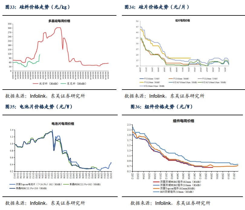 N 型电池片价格如下:183N、210RN 与 210N 均价本周下滑至每瓦 0.44 元人民币,183N、210RN 与 210N 价格区间则持平为每瓦 0.43-0.45 元人民币。因银浆回落与硅片下跌的电池片降价要求于本周落地,电池片厂家仍需加价购买白银现货,但实体白银采购的升水幅度也出现收窄,在生产成本下降后,电池片报价也相应出现下滑。在银价短期内相对持稳,电池片厂家成本可控的前提下,部分一线电池片厂家规划于春节假期后至三月份逐步复产,二三线厂家则多数持续观望,市场仍在等待节后终端需求的整体回温情况。