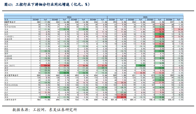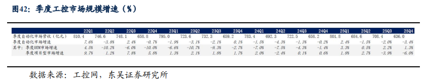 工控自动化市场2025年Q4整体增速-3.4%。1)分市场看,2025Q4 OEM&项目型市场持续复苏,锂电/包装/物流/注塑/食饮复苏较快。2)分行业看,OEM市场、项目型市场整体增速为 1.3%/-6.0%。